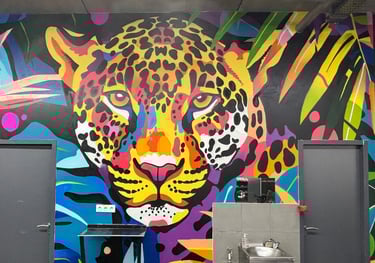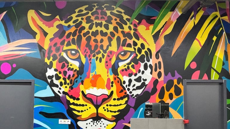 C’est en Amérique centrale, au Costa Rica, que j’ai eu le plaisir d’apercevoir un jaguar. Cette rencontre m’a plongé dans un rêve coloré que j’ai recréé sur ce mur.