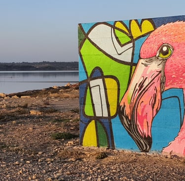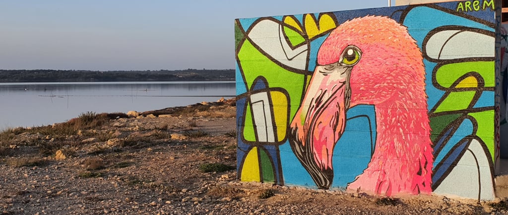 C’est en hommage à cette richesse que l’artiste Arem a réalisé une fresque de street art remarquable dans un style coloré et audacieux, inspiré de l’esthétique de Miami. Sur un mur en pleine nature, près d’un chemin où les promeneurs peuvent admirer les étangs, il a peint une tête de flamant rose, majestueuse et vivante. Les teintes vibrantes, allant du corail au turquoise, s’intègrent parfaitement dans le paysage et rappellent les reflets scintillants des eaux lagunaires au coucher du soleil.