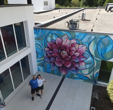 Le Dahlia Rose se distingue par sa composition florale riche et stylisée, où le dahlia, symbole de dignité et de gratitude, occupe une place centrale. Les pétales, aux nuances de rose et de violet, s'entrelacent pour former un motif dynamique et harmonieux. L'artiste a choisi de représenter cette fleur dans une version stylisée, presque abstraite, afin de créer une atmosphère apaisante et positive pour les résidents.
